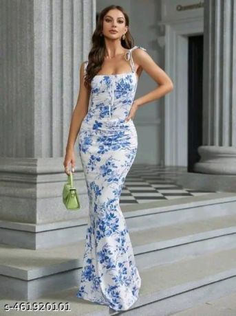 क्लेयर वुमेन्स ब्लु फ्लोरल बॉडीकॉन मैक्सी ड्रेस | स्लीभलेस स्लिम फिट समर पार्टी ड्रेस | एलिगेन्ट स्क्वायर नेक इभनिङ र वेडिङ वेयर