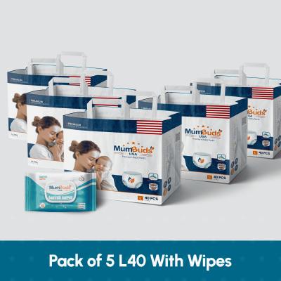 MumBuds American UltraThin Baby Diaper Large 40Pcs Pack of 5 with Wipes