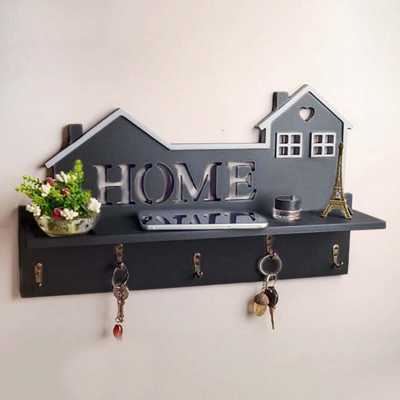 Ressence Enterprises Black Home Design Wooden Wall Shelf with 5 Key Holder