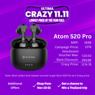 Ultima Atom 520 Pro Earbuds With 45Hrs Playtime| Game Mode(60ms)| Quad Mic| IPX5 Rated| Loud Sound & Deep Bass| Type-C Charging Port Wireless Earbuds